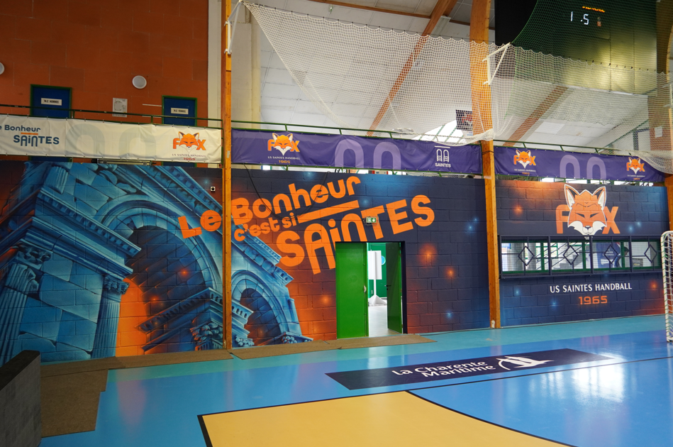 Partenaire de l’US Saintes Handball depuis plusieurs années, l’Agence d’Attractivité de l’Agglomération de Saintes s’est associée à la Ville de Saintes pour donner au Gymnase du Grand Coudret une identité visuelle forte, cohérente avec les valeurs et les couleurs du territoire.