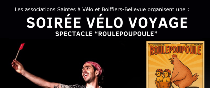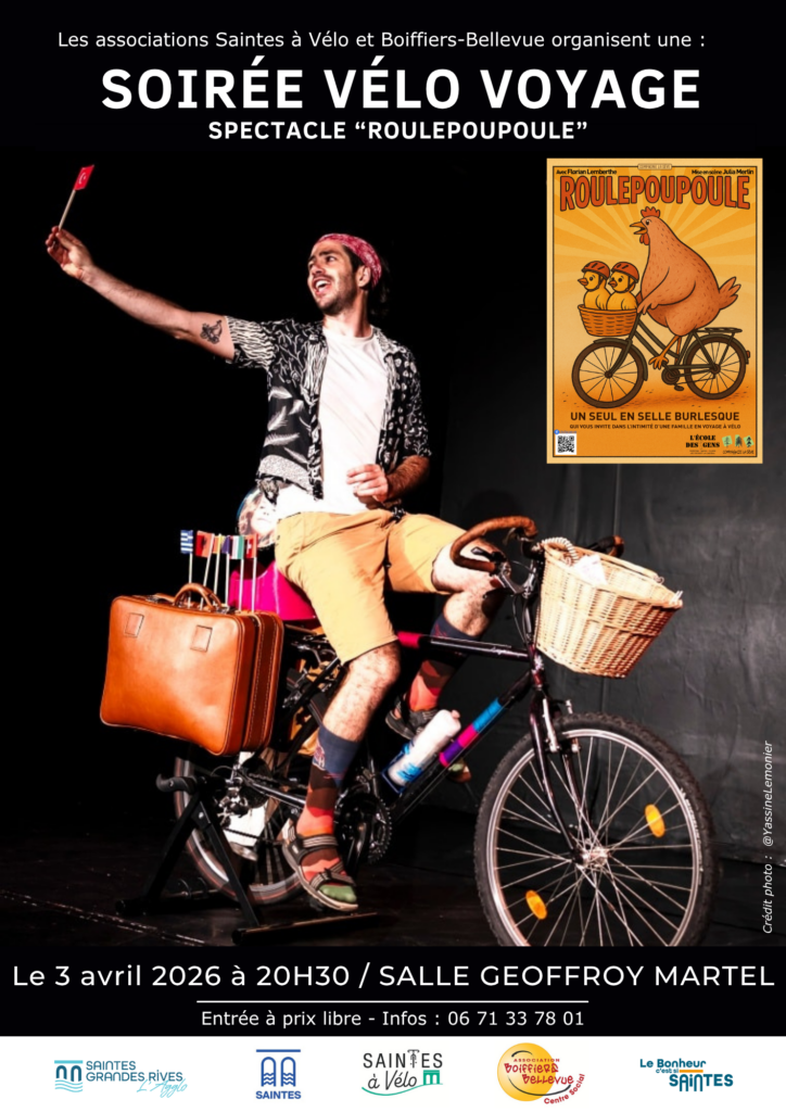 Organisée par les associations Saintes à vélo et Boiffiers-Bellevue, la soirée accueille le comédien Florian LEMBERTHE (Compagnie la Sève) pour un spectacle burlesque intitulé « seul en selle ».